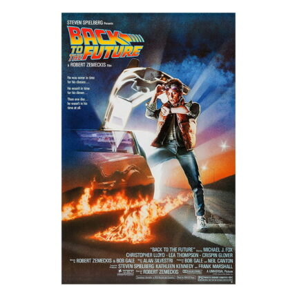 Retro-style Back to the Future poster showcasing the iconic DeLorean, Marty McFly, and time-travel vibes. A must-have for movie enthusiasts!